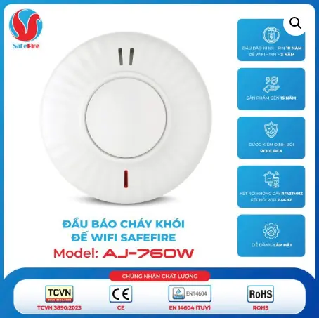 Đầu báo cháy khói liên động không dây kèm đế Wifi SafeFire AJ-760W là một thiết bị thông minh và hiệu quả dùng để phát hiện khói và cảnh báo nguy cơ cháy nổ ở thời điểm sớm nhất. Thiết bị này kết hợp kết nối Wifi, kết nối với điện thoại di động giúp bạn giám sát một cách dễ dàng và chính xác.